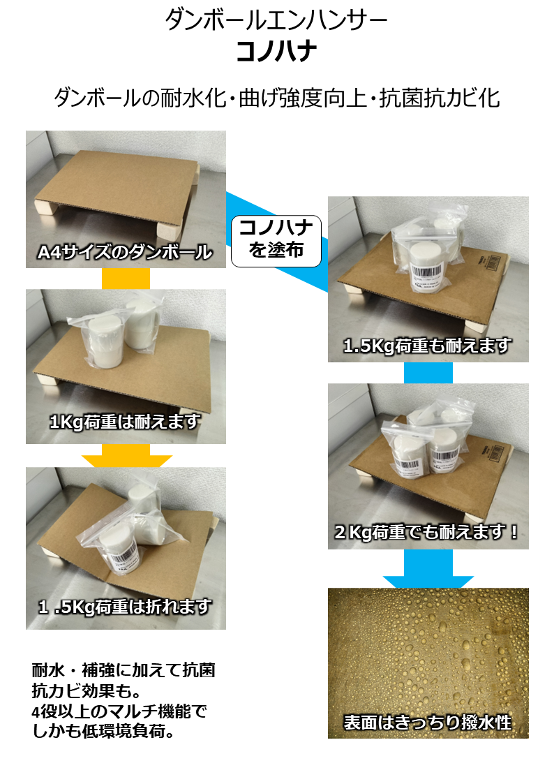CB10は、被災地のダンボール用に設計され、日本本来の森の力によってダンボールの耐水化・高強度化・抗菌化・抗カビ化を持つ多機能コーティング剤です。CB10を塗布したダンボールは湿気の多い環境でも安心して使用出来るようになります。■ 素材/製...